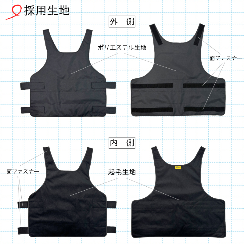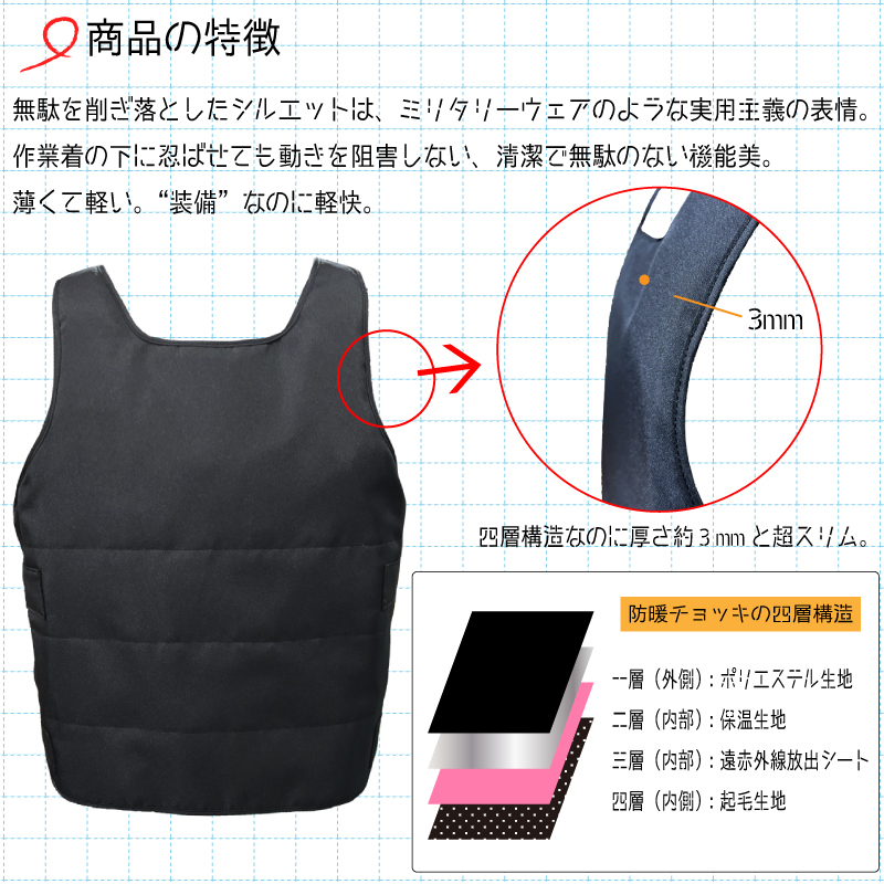 本体は、外側生地・遠赤外線放出シート・内側生地に今回新たに保温生地を追加し四層構造になりました。厚さは約3mmと超薄型。ジャケットや作業着の下にインナーとしてもご着用いただけます。
