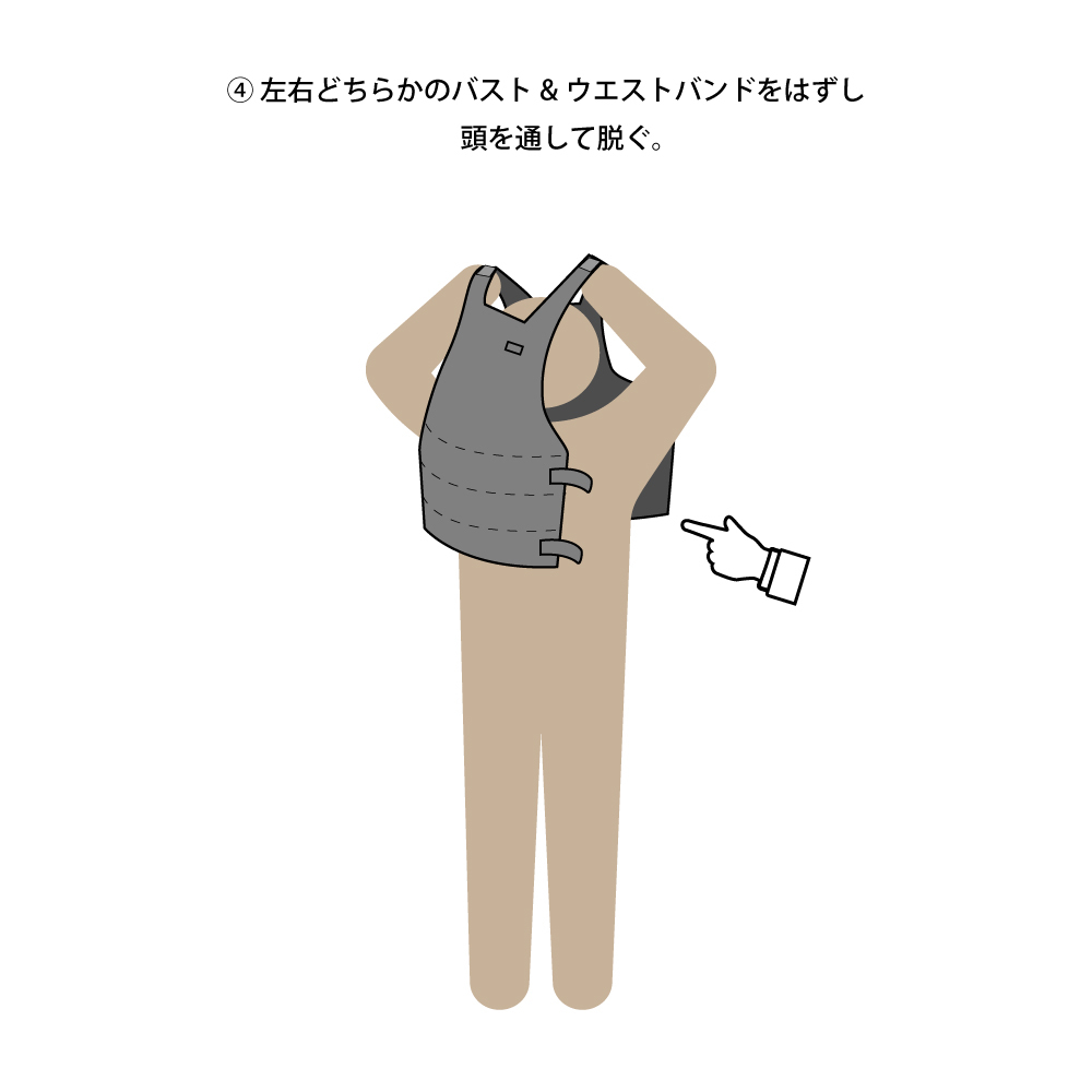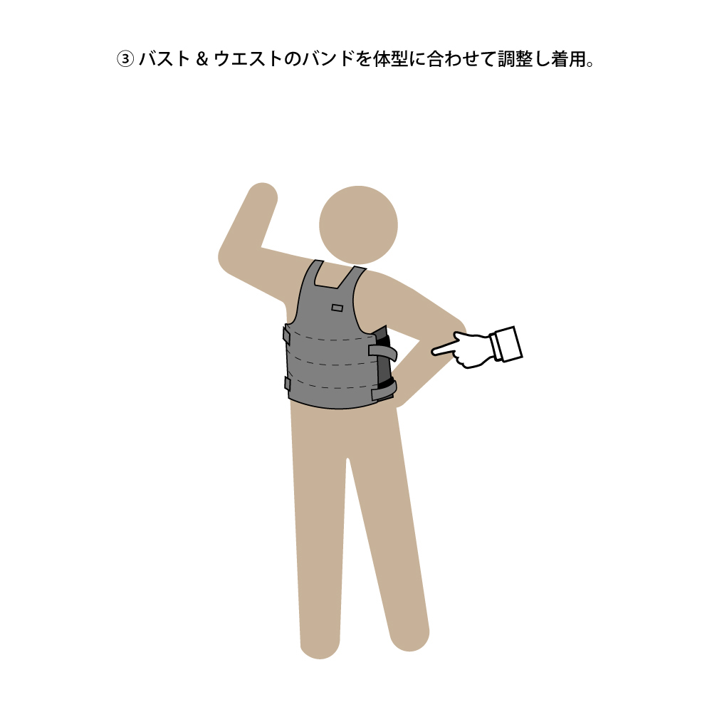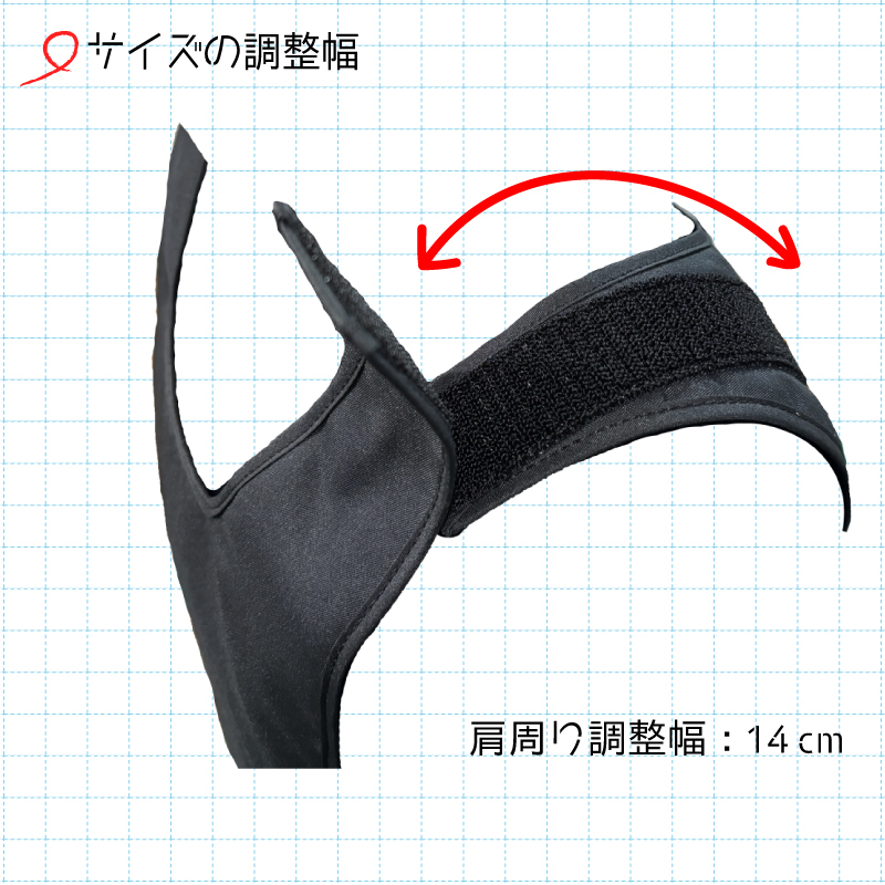 前身頃と後身頃が完全に分離する構造で、面チャックを使い各部のサイズ調整が自由自在。ユーザーの体型&好みにジャストフィット致します。