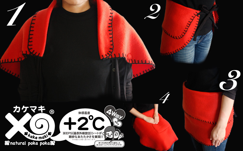 カケマキとは、肩かけ・膝かけ・腰まき・腹まきの4通りの使い方ができる、とっても便利でとってもエコでカワイイ、遠赤外線グッズです。(日本製)