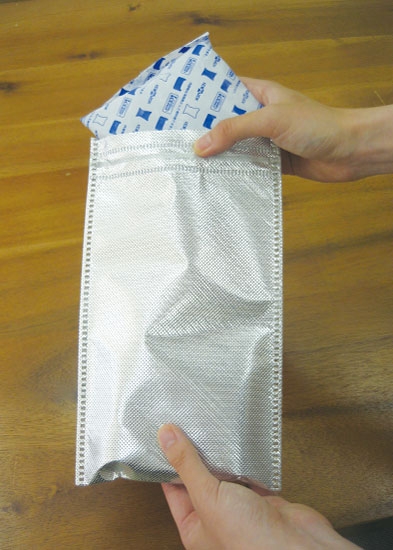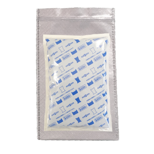 保冷袋は薄いアルミ蒸着シートですが、高気密チャックがついていて保冷効果が高く、また、万が一保冷剤が破れた際でも保冷剤の内容物が外に漏れることを防ぐことができます。 また、アルミ蒸着シートに高気密チャックをつける技術は日本で1社しかなく、他社がマネする事の出来ない技術です。 さらに、袋の端にステッチを施すことで保冷剤をズレにくくし、ズレて重なることを防ぐように作られています。